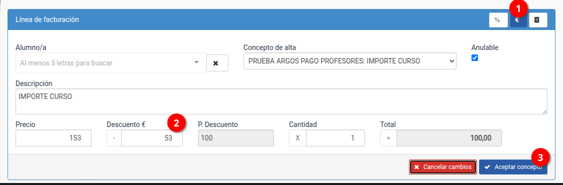 Tenemos un curso de pago mensual 153,00€, pero por motivos específicos, este mes al alumno queremos cobrarle solo 100€.
