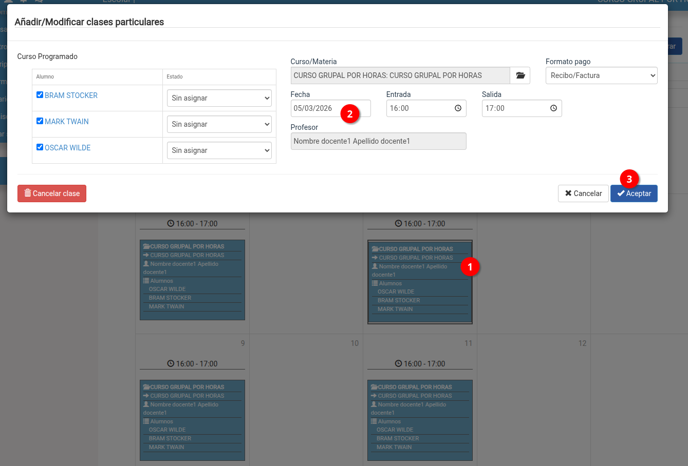 - Escogemos el nuevo día donde se impartirá la clase (2) y su horario en caso de cambiar.