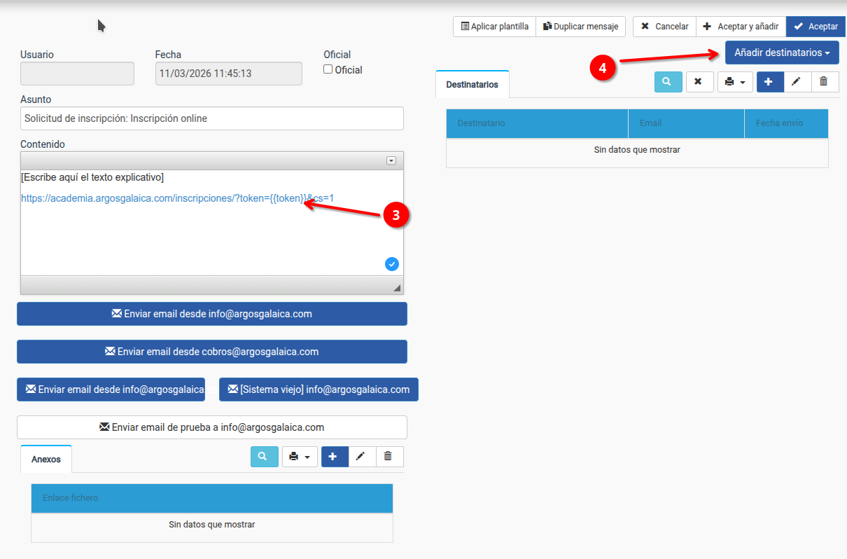 Luego tendríamos que añadir como destinatarios (4), los alumnos a los que queremos mandar el email. Debemos escoger siempre alumnos, de forma que el sistema pueda controlar sus altas y sustituir el token.